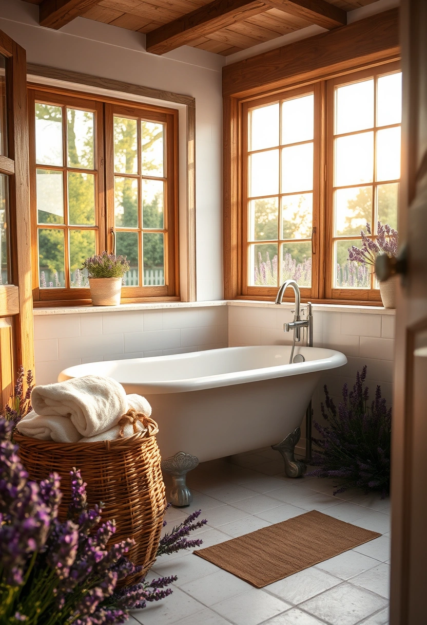 For those who appreciate vintage aesthetics, a traditional outdoor bathroom featuring a clawfoot tub surrounded by fragrant lavender offers a charming escape. The antique white tiles and rustic wooden accents evoke a nostalgic feel, while a large window provides views of the garden, allowing nature to become part of the experience.